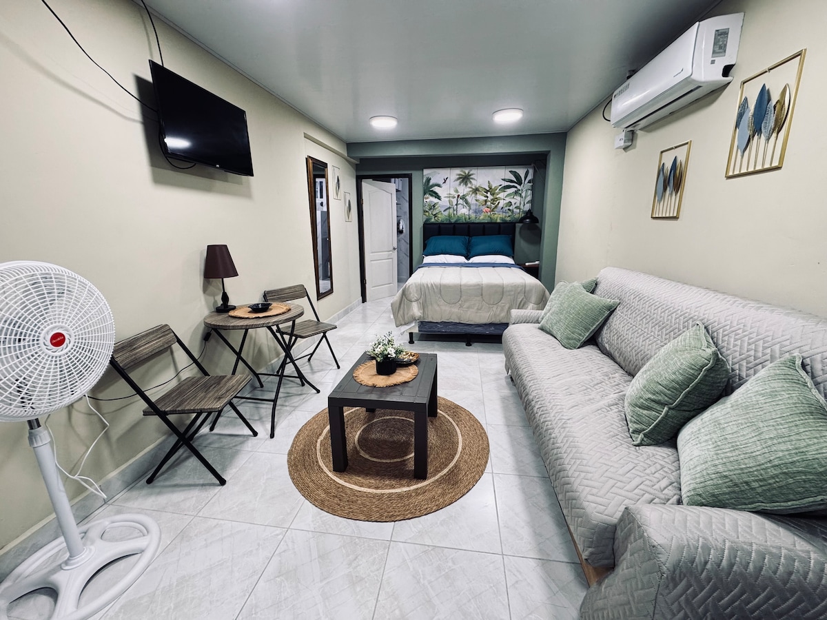 Encantador pis nou amb una acollidora habitació d'una peça moblada perfecta per gaudir amb el teu acompanyant, amb cuina equipada (nevera, microones, estufa elèctrica, torradora, bullidor elèctric), bany, aire condicionat i un lloc de treball, a més amb un pati amb boniques vistes a un arbre ceiba. Excel·lent ubicació, amb accés pavimentat: Centre: 8 min. Moll de Cabotaje - 10 minuts Aeroport internacional de Golosón: de 20 a 25 minuts Farmàcia més propera: 3 minuts