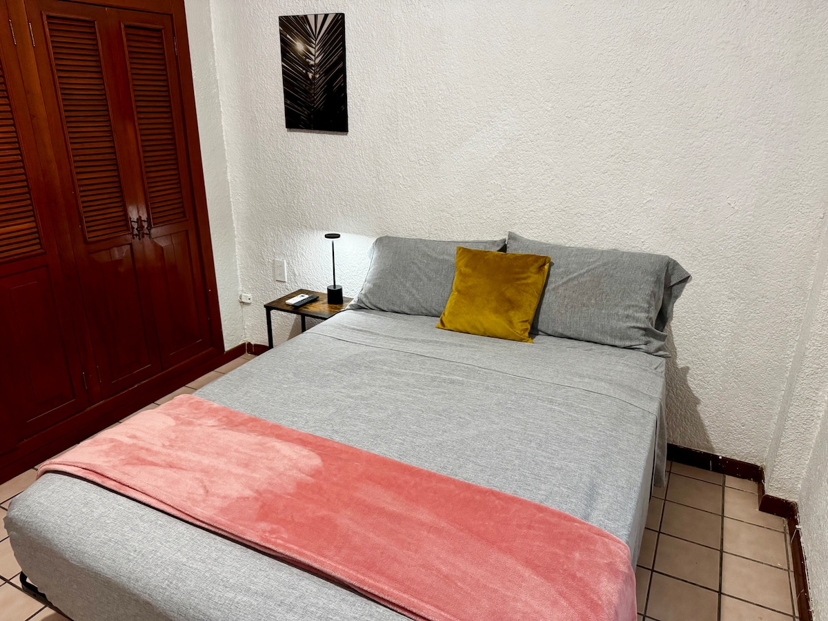 Pequeña habitación hasta para 2 personas se encuentra en un 3 nivel. Esta en un condominio de 3 departamentos con acceso limitado y seguro. La habitación cuenta cama matrimonial, Buro con lámpara, aire acondicionado, ventilador de techo, smart tv de 32”, barra / escritorio con frigobar, microondas, licuadora, parrilla eléctrica, vajilla, cubiertos y vasos para 2 personas, olla y sartén, baño con closet.