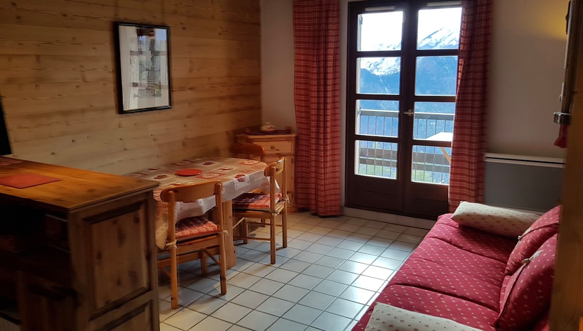 Estudi lluminós amb un ambient de muntanya, orientat al sud-oest amb balcó, situat davant del remuntador i les botigues Alpe Express (skipass,, esf. Lloguer d'equips, supermercat, restaurants, bar, bugaderia). Sala d'estar formada per una cuina equipada: rentaplats, microones, cafetera Senseo i torradora. Sofà llit (130x190 cm) i 2 lliteres (80x190 cm) retràctil. Sala de dutxa i vàter independent, rebost d'emmagatzematge. Taquilla d'esquí privada. Llençols addicionals a petició