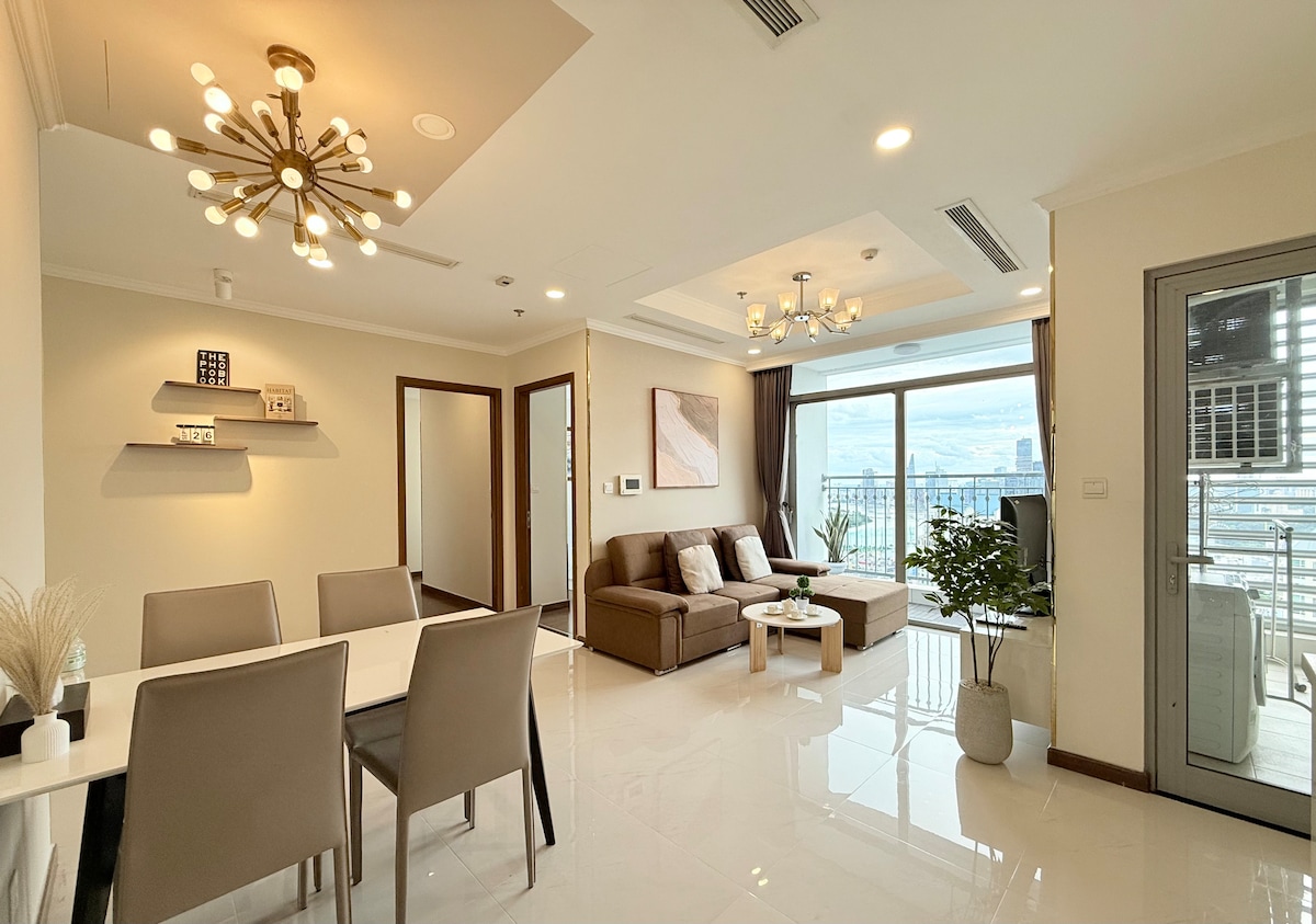 Et donem la benvinguda a la teva elegant casa al cor de Vinhomes Central Park, una de les residències més luxoses de la ciutat de Ho Chi Minh. Perfecte per a famílies, parelles o viatgers de negocis. 🛋 Característiques del pis • 2 dormitoris acollidors amb llits «queen size» i llençols nets • 2 banys amb aigua calenta i equipament i serveis complets • Sala d'estar lluminosa amb sofà i televisor intel·ligent (amb Netflix) • Cuina totalment equipada (nevera, fogons, microones, estris de cuina) • Rentadora, aire condicionat i wifi d'alta velocitat