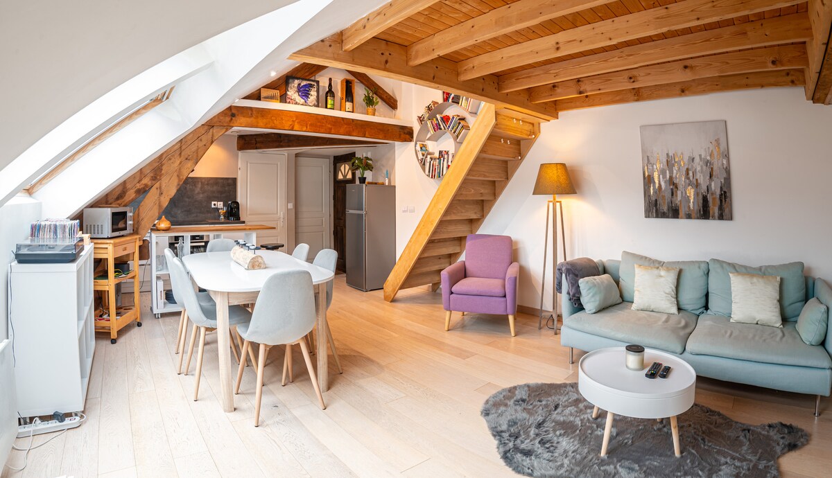 Vine i descobreix "Le Panorama" al centre de Voiron, molt a prop dels animats carrers per a vianants. L'apartament està situat al pis superior, orientació est, amb una vista esplèndida de l'estàtua del Vouise, els massissos de la Chartreuse, la Torre Barral, l'antic hospital de Voiron, la Catedral... La decoració és moderna amb un toc escandinau.