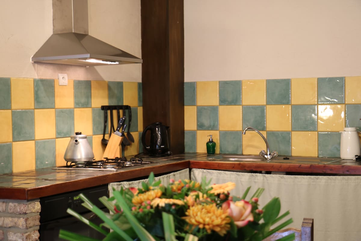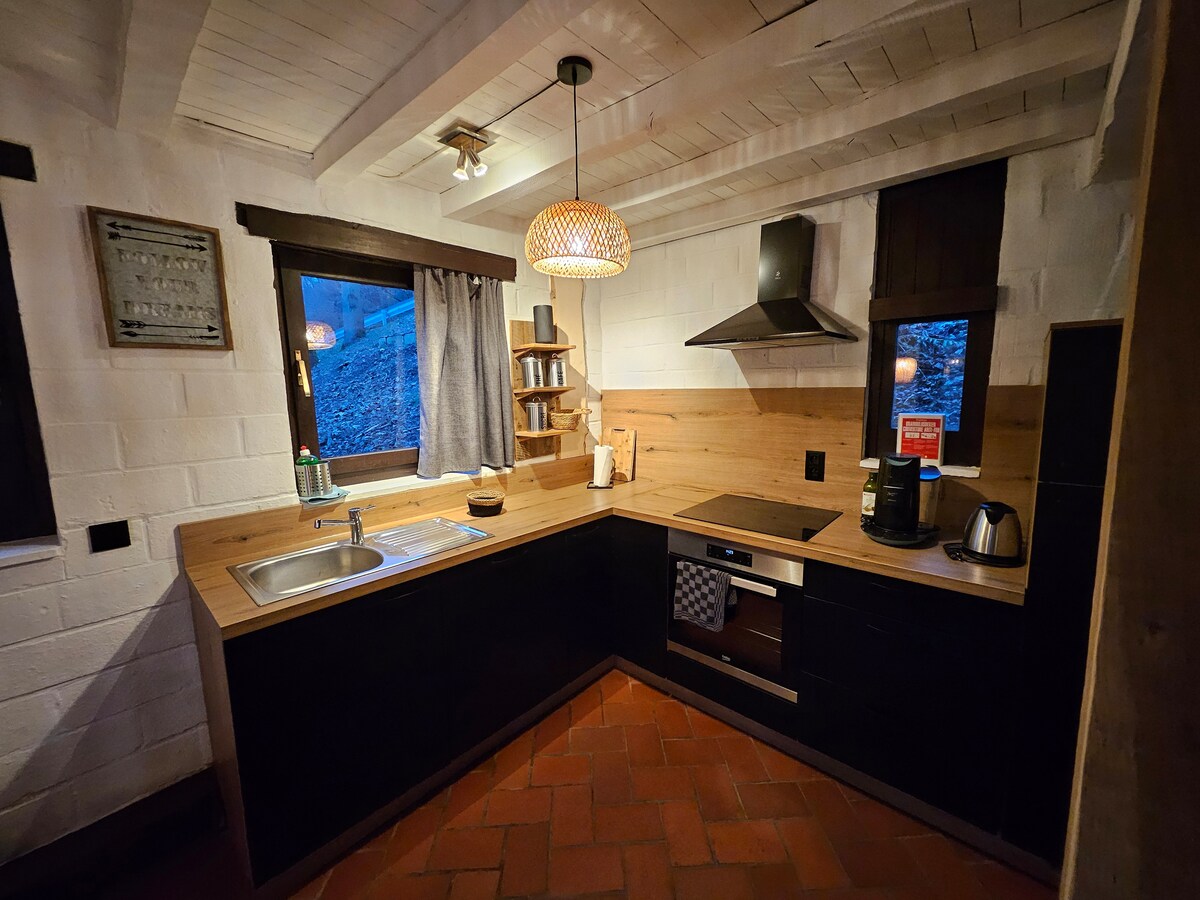 Casa RURAL ZEN.... Detalls de les habitacions: superfície total: 42m2. Una bonica cuina totalment equipada (1 taula + 2 cadires, 1 nevera, forn microones, vitroceràmica, 1 cafetera, més estris de cuina) La cuina s'obre a la sala d'estar i a una porta de vidre que dóna a una terrassa de 18 m2 amb una taula de jardí + parasol per a 2 persones, 2 cadires i barbacoa. 1 sala d'estar amb un sofà llit + taula de cafè. Un bany agradable amb dutxa, lavabo / mirall i 1WC.