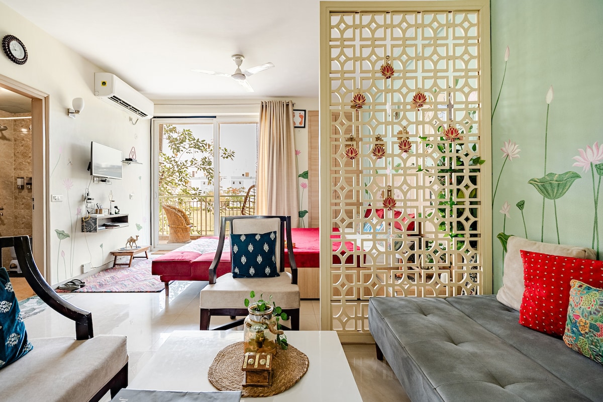 Peaceful, pretty & artsy! Less than 3 Kms (10min) from Prem Mandir, 3.5 Kms (12min) from ISKON and (15min) 4.5 Kms from Banke Bihari Step into a world of art and tranquility at our Pichwai-themed studio. This beautiful home features elegant fittings, stunning interiors, and a charming sit-out balcony perfect for relaxation. Enjoy easy access to prime temples, immersing yourself in the spiritual essence of Vrindavan. Abundance of modern amenities to ensure a comfortable and memorable stay.