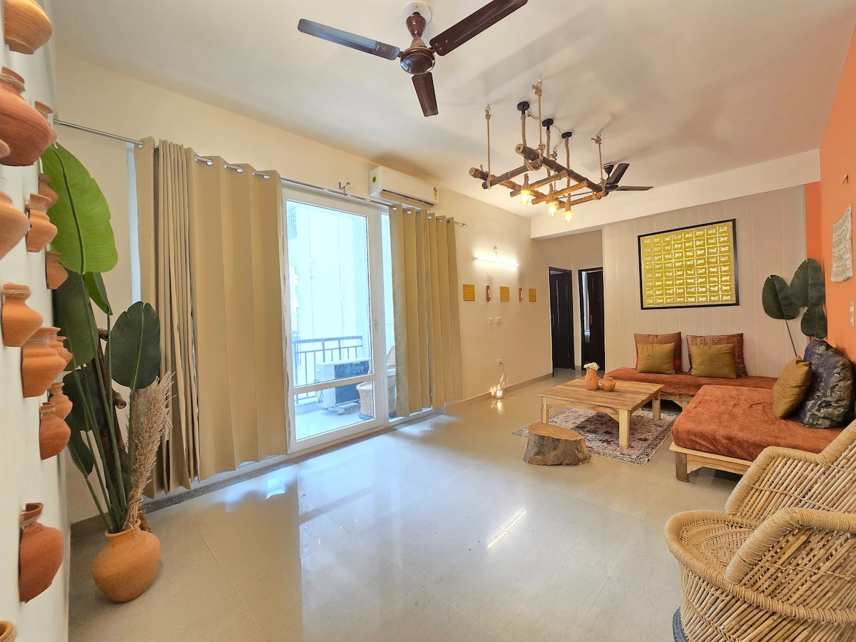 Stay at this nest inspired by the greens of the Vrindavan - fall in love with smaller details of this apartment that remind you of forest, absolute green that help you relax & rejuvenate during your trip to dham! 3 Kms (10min) from Prem Mandir 3.5 Kms (12min) from ISKON 4 Kms (15min) from Banke-Bihari A perfect blend of nature and comfort, this green-hued haven is designed to help you relax, reflect, and reconnect. Unwind in the cozy lounge or enjoy a cup of chai in the sit-out at the balcony