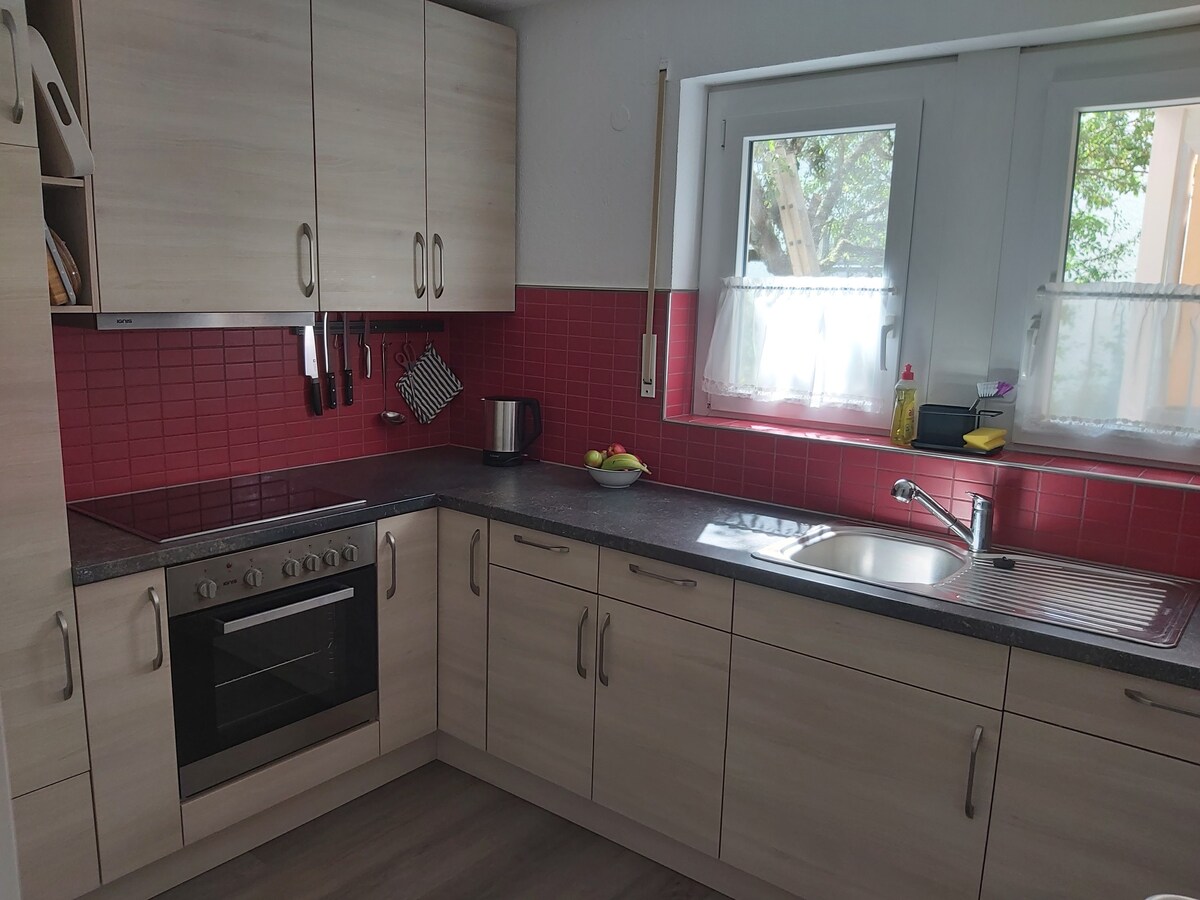 Et donem la benvinguda al teu refugi amb estil! Aquest apartament moblat amb molt de gust al 2n pis ofereix una sala d'estar, un dormitori acollidor, un estudi pràctic i una cuina totalment equipada. La wifi d'alta velocitat, el garatge i un jardí idíl·lic, que es pot fer servir durant els mesos càlids, garanteixen la comoditat. Ubicació tranquil·la, a 8 minuts del centre, a prop del Rin i de la frontera suïssa. Ideal per a viatges de negocis i de plaer: per a 3 hostes amb llit doble i un sofà llit còmode. Televisor amb streaming inclòs.