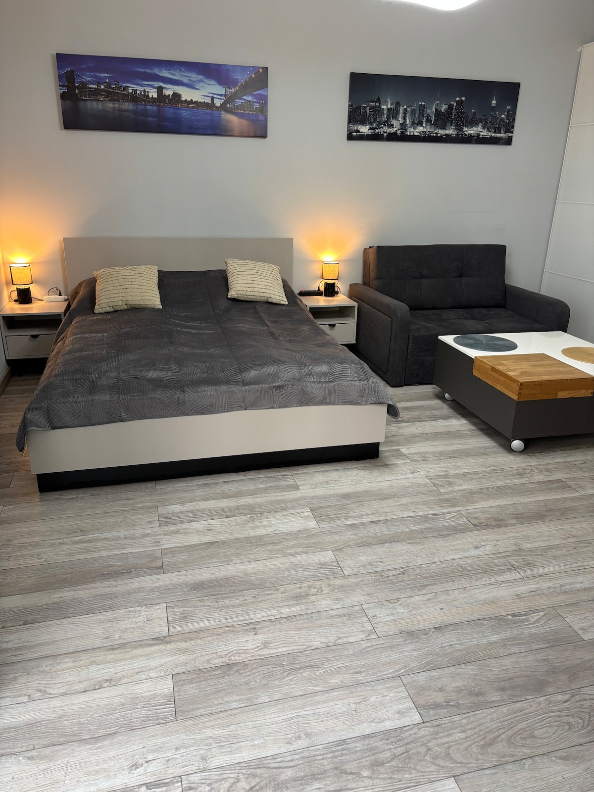 Apartament studio znajduje się w samym centrum miasta. Oddalony 1 km od Pałacu Kultury i 1,4 km od Dworca Centralnego. Jest świeżo, nowocześnie i komfortowo wykończony, w pełni wyposażony. Posiada TV kablową z WIFI, klimatyzację, podwójne łóżko, dużą łazienkę z prysznicem w jasnej kolorystyce. W otwartej kuchni znajduje się płyta elektryczna, lodówka, pralka, ekspres do kawy oraz czajnik elektryczny. Do dyspozycji gości mamy przestronne szafy z półkami, wieszakami i żelazkiem.