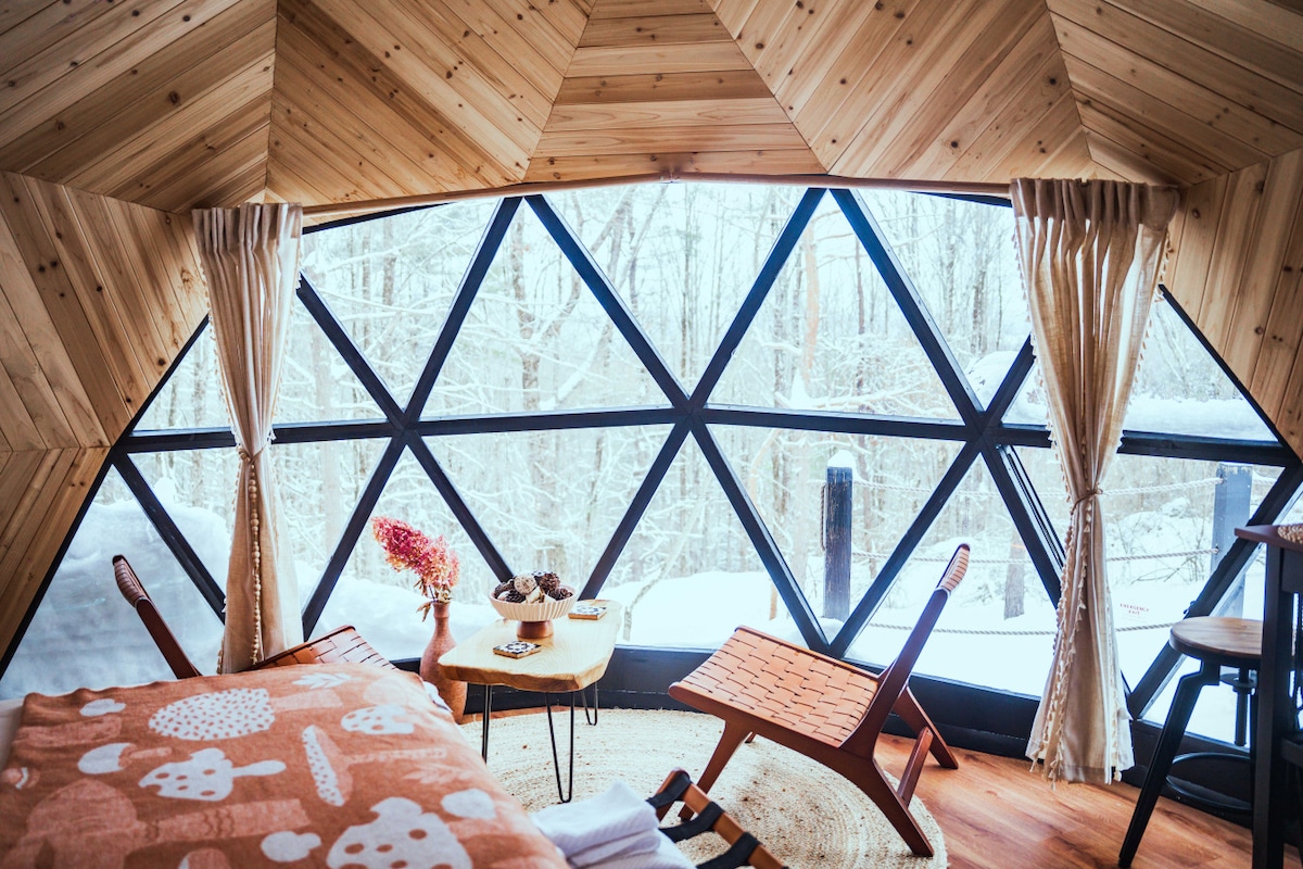 Refugi a la natura amb minicases modernes i cúpules geodèsiques.