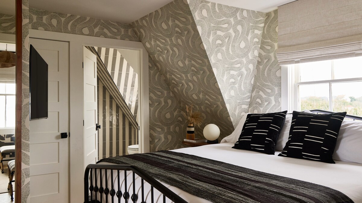 Step into the Vintage King Deluxe at Block Island Beach House—a fun, eclectic tribute to the Surf Hotel’s vibrant past, complete with quirky surf shack décor and charming village views from the 2nd floor. Designed for two guests, this room features a plush king bed, private bath with walk-in shower, and LED flatscreen TV. Added comforts include blackout drapes, a mini-fridge, safe, USB outlets, and free Wi-Fi. Ideal for guests who love unique style and playful character in their coastal retreat.