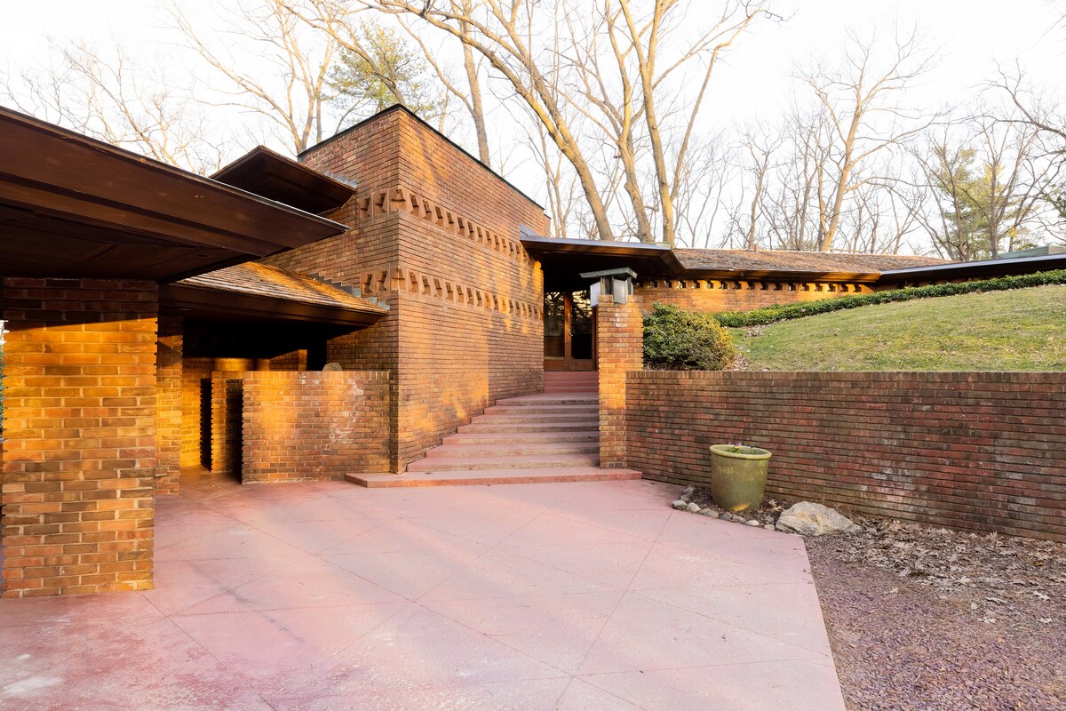 Actualment, el nostre calendari està obert fins al 31 d'agost de 2026. EL CAP DE SETMANA DE GRADUACIÓ DEL 2026 NO ESTÀ DISPONIBLE. Aquesta casa és una casa de maó i xiprer de diversos nivells de l'època tardana de Frank Lloyd Wright, la planta i el disseny de la qual es basen en el triangle equilàter. La casa està situada en 2 hectàrees molt boscoses en un barri aïllat d'Ann Arbor.