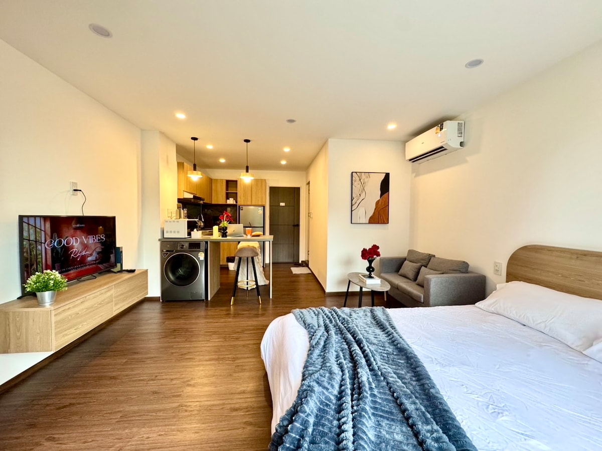 Un apartament sencer espaiós amb bany privat, cuina petita, sala d'estar/menjador, 1 dormitori amb zona de treball designada i balcó. Gaudeix de les finestres amples per gaudir d'unes vistes ininterrompudes i de molta llum solar, augmentant l'aire per gaudir d'una estada més relaxant. Gaudeix de totes les comoditats de la vida a la ciutat, incloent-hi: - 5 minuts a BTS Asok, MRT Sukhumvit - A 5 minuts de la Terminal 21, Emporium/Emquartier i Benjasiri Park - 1 minut a 7-11 botiga de queviures - Molt de menjar de carrer, cafeteries i taxis/bicicletes