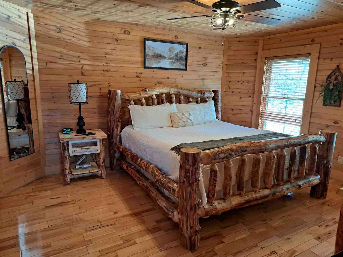 Una caseta de fusta acollidora situada al cor dels Smoky Mountains, a 11 km del centre de Pigeon Forge. Relaxa't i gaudeix de la llar de foc de llenya en una nit fresca o gaudeix de la tranquil·la foguera al nostre preciós terreny boscós de 3/4 acres. Observa la fauna salvatge des de la terrassa que envolta la casa amb una vista encantadora de l'estany, on pots pescar. La banyera d'hidromassatge t'espera després d'un llarg dia gaudint de les muntanyes! Per a un toc especial final, gaudeix de la preciosa banyera romàntica en forma de cor. Aquesta caseta és una escapada romàntica perfecta.
