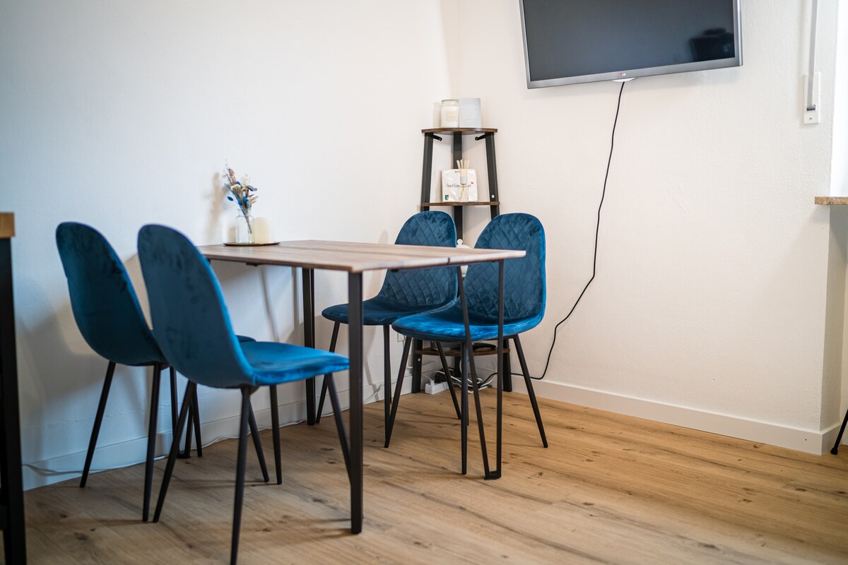 Das Appartement hat einen eigenen Eingang. Über den Treppenabgang kommt man ins Souterrain mit Vorraum und Garderobe. Im ersten Raum befindet sich die Wohnküche mit Sitzcouch und Tisch, Küchenzeile und TV. Durch einen offenen Durchgang kommt man in das Schlafzimmer mit Kleiderschrank, Bett 1,40 cm breit und Schreibtisch. Im Anschluss befindet sich die Schiebetür zur Dusche mit WC.