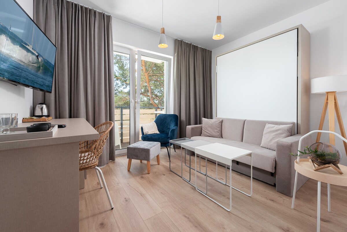 Nowoczesny apartament z zachodnim balkonem, zaprojektowany dla dwóch do czterech osób (dodatkowe osoby wymagają dopłaty). Sypialnia z łożem małżeńskim i możliwością dostawienia łóżeczka dziecięcego. Salon połączony ze specjalnie zaprojektowanym, w pełni funkcjonalnym aneksem kuchennym, dodatkowo zawiera rozkładaną dwuosobową kanapę.