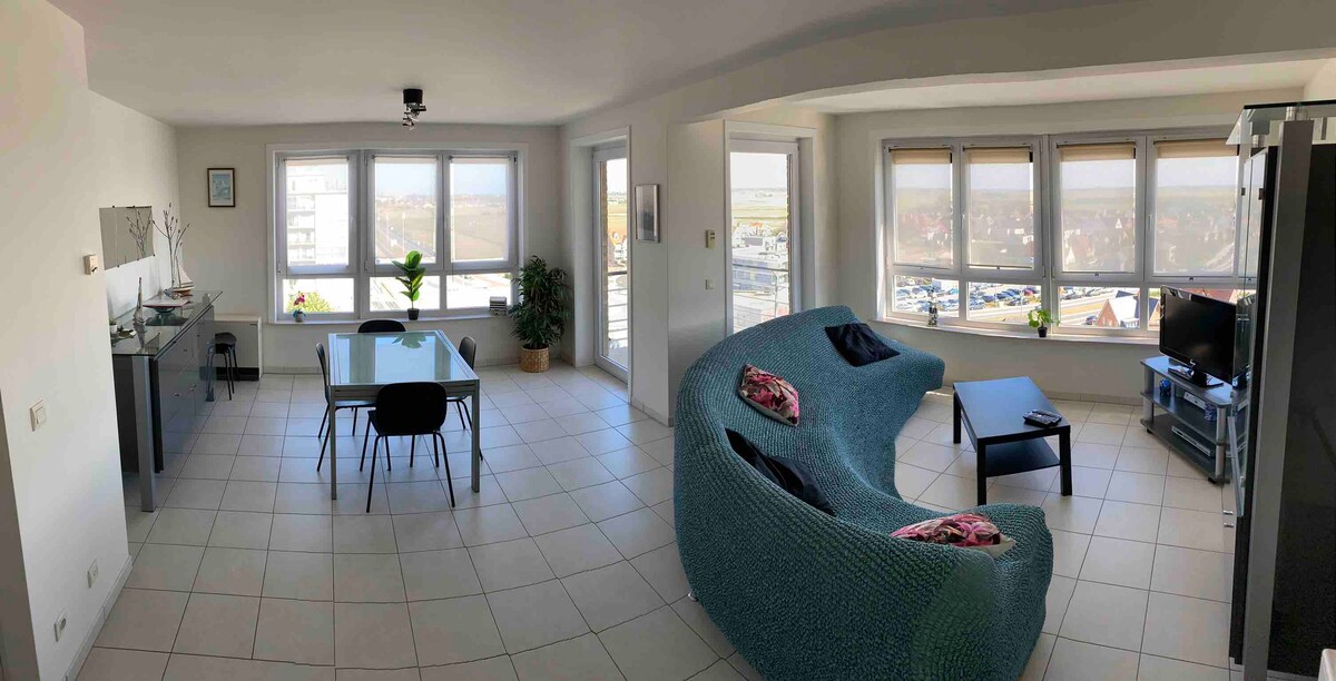Apartament al terrat recentment reformat situat al passeig marítim de Blankenberge, a prop del port esportiu. - 2 espaioses terrasses amb vistes al mar i polder respectivament. A prop de Bruges, Knokke, Damme, Ostende, Veurne i Ypres. Entrades a través del passeig marítim (al costat del mar) i del port esportiu. L'ascensor puja a la novena planta, les escales condueixen a l'àtic de la desena planta. Els llençols i les tovalloles estan inclosos en el preu del lloguer.