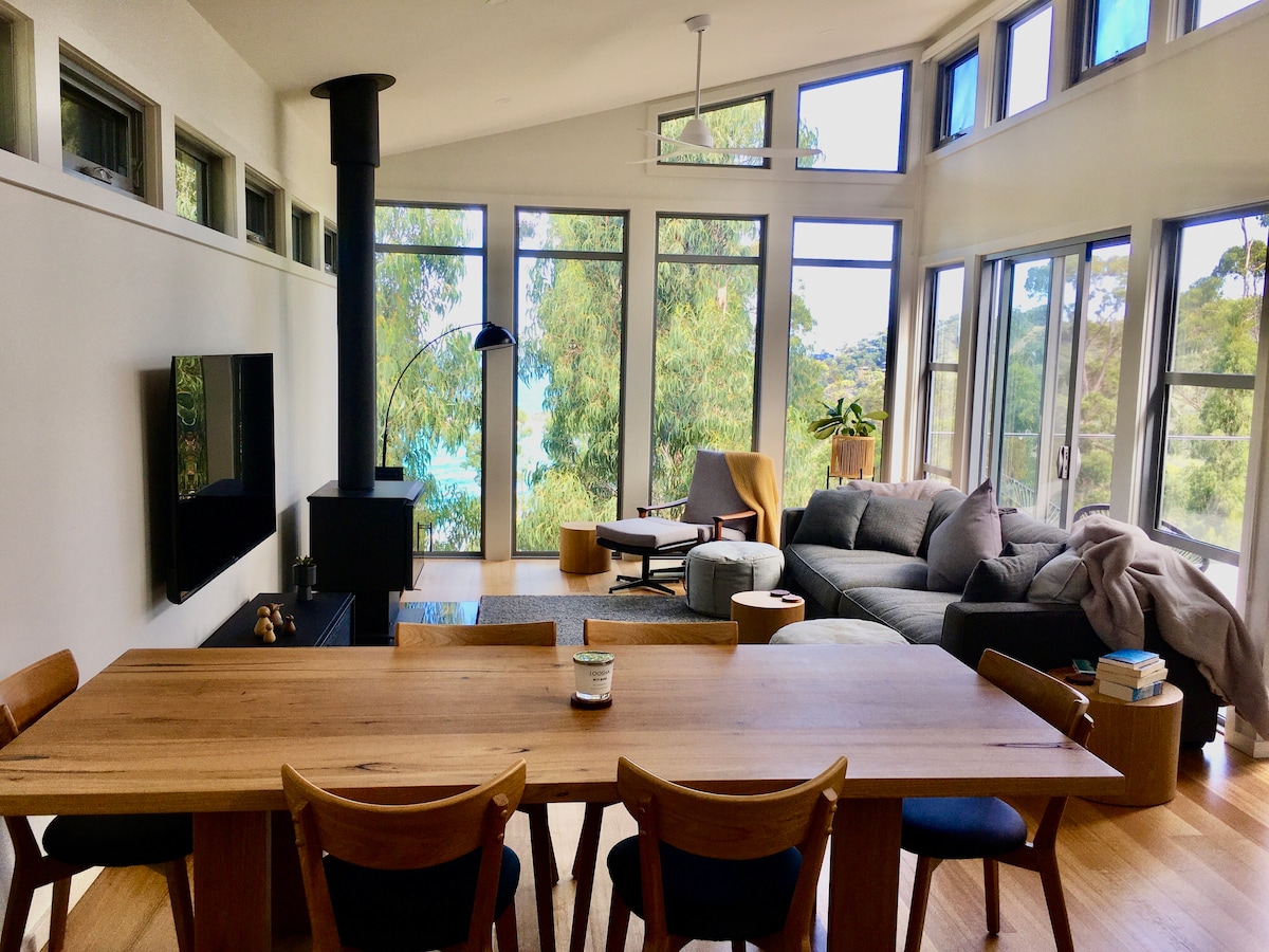 The Eyrie, situat a 300 metres sobre l'oceà Antàrtic, a les muntanyes Otway, és una troballa única: una finca privada de 11 hectàrees amb selva tropical, un passeig amb cascada, llames residents i vistes panoràmiques al mar des de totes les habitacions. A només 5 minuts d'Skenes Creek i a 11 minuts d'Apollo Bay; s'admeten animals de companyia. Superhost amb més de 250 avaluacions.