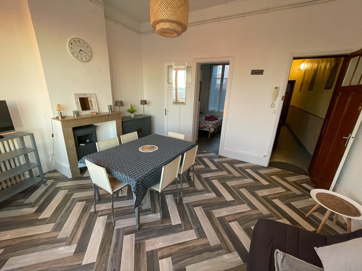 Pis d'1 dormitori, davant del Kursaal, a 150 metres de la platja de Malo-les-Bains, a la tercera planta d'una residència petita i tranquil·la sense ascensor. Aparcament gratuït. Autobús gratuït a 150m. Kursaal, Casino i piscina a 100m. Allotjament compost per una sala d'estar + SmartTV 55 ', WIFI, NETFLIX, 1 dormitori 1 llit de 160x200cm + TV 32 ', menjador + cuina (rentaplats, microones, cafetera, bullidor, torradora, nevera...). Bany amb dutxa + vàter. Xampú, gel de dutxa no proporcionat.