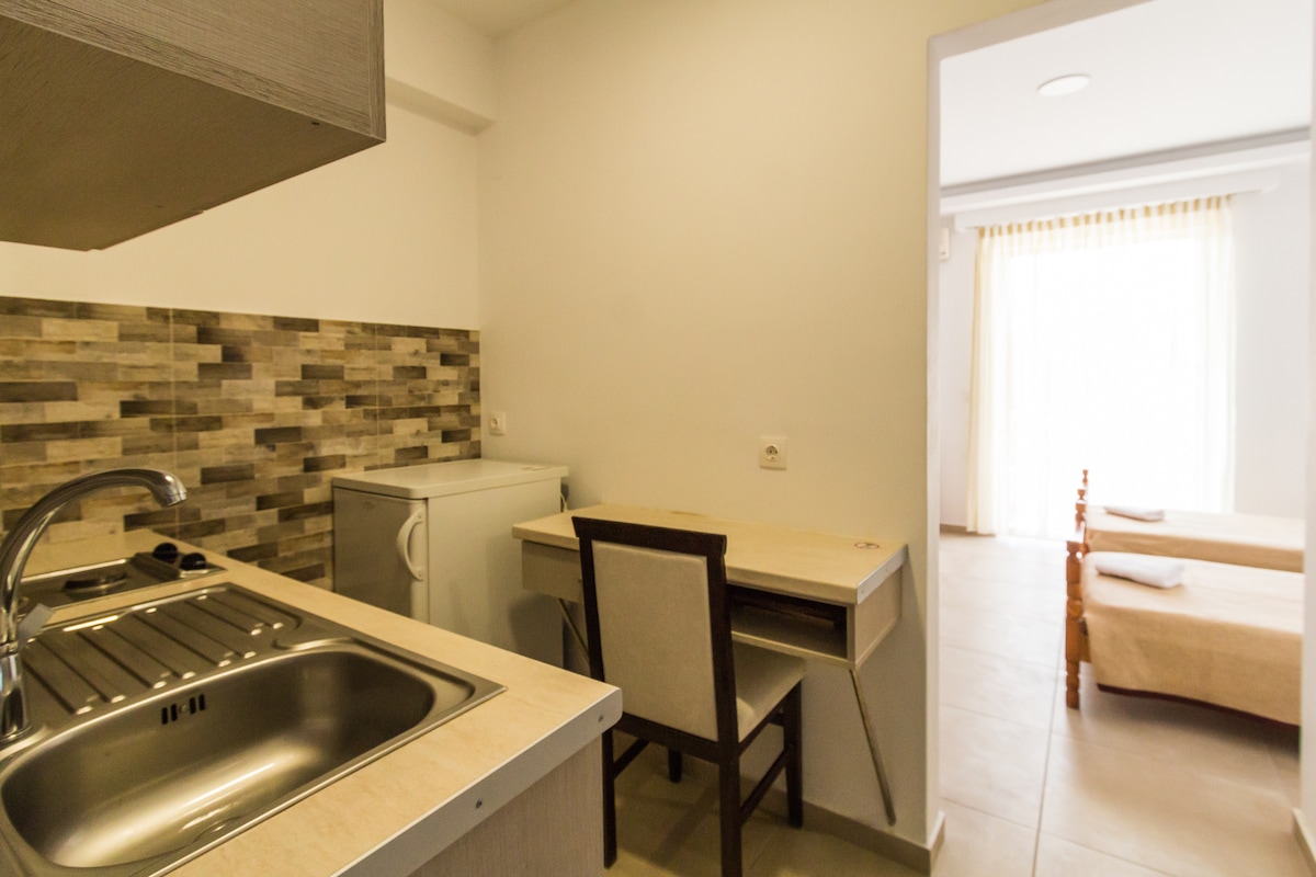 Els nostres estudis estan situats en una ubicació tranquil·la al cor de Laganas, a prop de tot. La platja de Laganas està a només 400 metres (a 5 minuts a peu) i amb només 2-3 minuts a peu pots arribar a una cafeteria, un mini mercat i molts restaurants i bars agradables. Al mateix temps, la franja principal de Laganas amb moltes discoteques està a només 600 metres (6-7 minuts a peu).