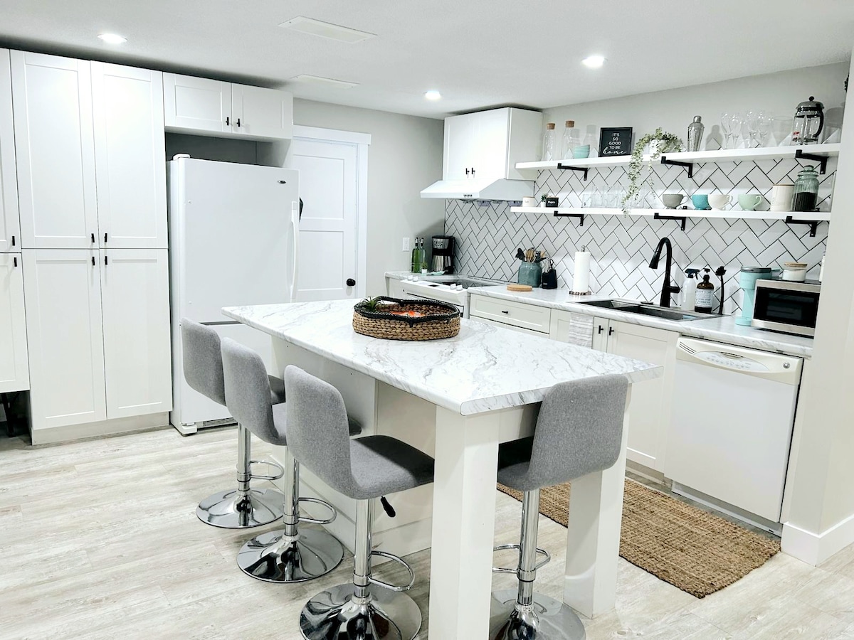 Recentment hem renovat el soterrani per crear una suite d'hostes elegant, moderna, acollidora i tranquil·la. Hi ha una entrada lateral que s'obre directament a les escales que et porta fins a l'allotjament. Disposa d'una porta exterior metàl·lica amb pany per a insonorització i seguretat. L'habitació és un apartament d'estudi lluminós amb tres finestres grans, cuina completa, sala d'estar amb televisor i llar de foc, taula de menjador, llit queen size, vestidor i bany privat amb dutxa de cinc peus. Amb una exhaustiva insonorització!