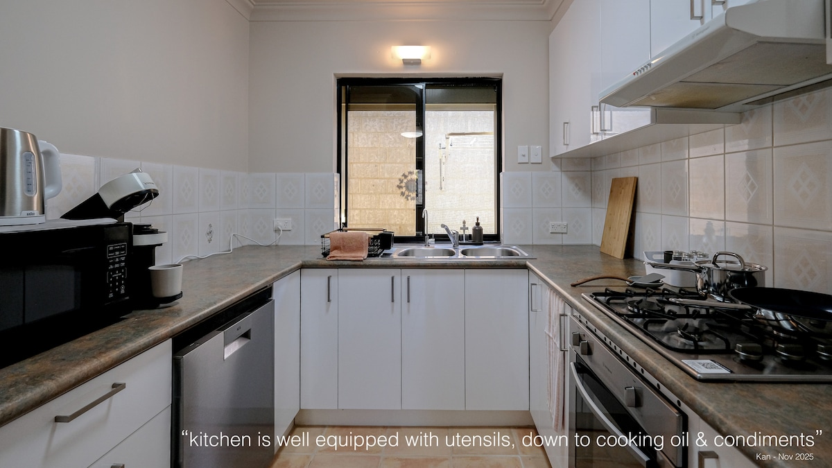 Et donem la benvinguda al teu refugi de pau a Perth. Aquest allotjament amb esmorzar inclòs, de disseny atractiu, ofereix un dormitori espaiós amb un gran armari, una zona d'estar lluminosa amb un espai de treball exclusiu i una cuina totalment equipada per a una vida còmoda. Perfectament situat a prop de botigues i a poca distància de l'autobús cap a Perth CBD, aquest amagatall tranquil combina comoditat amb tranquil·litat total, ideal tant per a la feina com per a la relaxació.