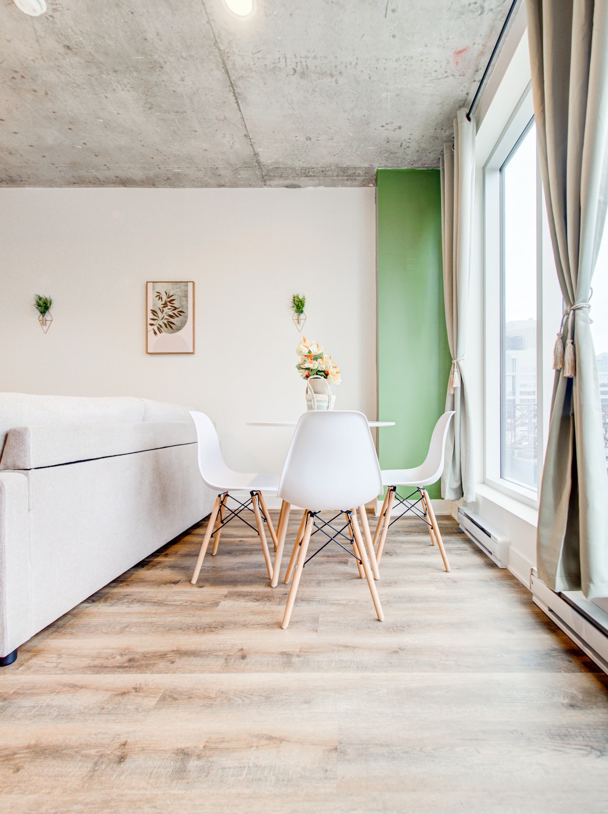 Aquest apartament lluminós i modern ofereix una vista panoràmica de Mont-real, amb postes de sol impressionants. L'interior disposa d'una decoració inspirada en la natura amb tons d'oliva suaus, creant un ambient càlid i relaxant. Amb una ubicació ideal al carrer Sainte-Catherine, a pocs passos de les estacions de metro Atwater i Guy-Concordia, estaràs envoltat de cafeteries de moda, restaurants, botigues i el centre comercial Alexis Nihon. Un lloc perfecte per gaudir de l'energia vibrant de Mont-real mentre et sentis com a casa.