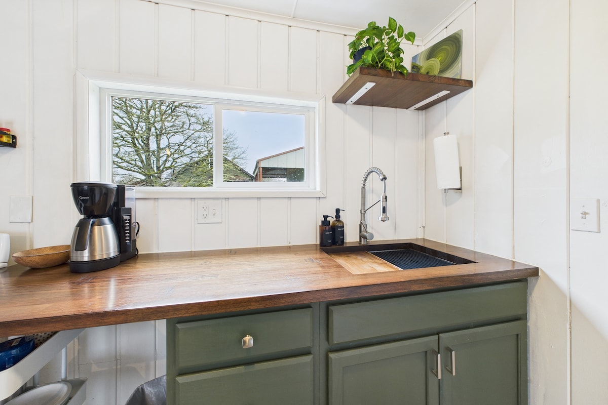Acollidor espai d'1 dormitori i 1 bany amb un gran loft amb vistes a l'espai principal. El dormitori de la planta baixa té un llit queen i un loft accessible per a una escala té un llit king. Allotja't perfectament per a grups petits de 4 persones, sense incloure un hoste addicional que pugui sentir-se còmode amb la bessona. UNA GRAN terrassa al davant per veure la posta de sol i fer la graella durant la nit! Trobaràs la cuina de mida de pinta equipada amb els elements bàsics. Tot és de mida de pinta, incloent-hi la estufa de 4 cremadors i la 1/2 nevera.