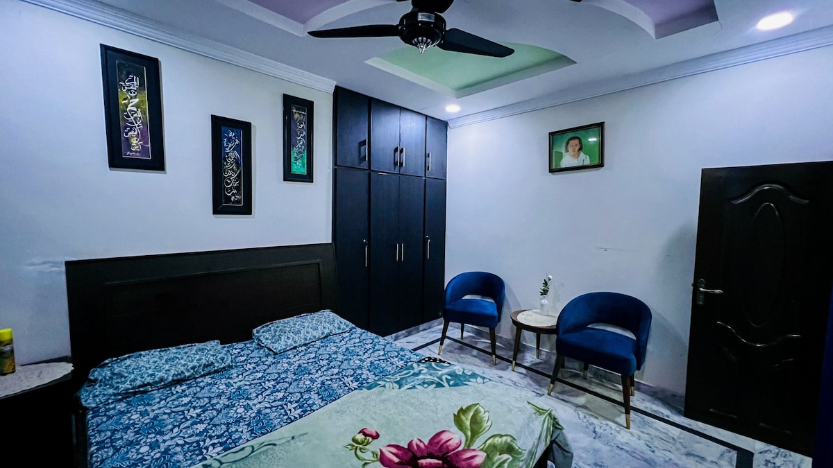 Entra al teu espai privat on l'elegància es troba amb la calma.Aquest apartament, dissenyat amb cura, presenta una decoració minimalista, una il·luminació càlida i uns interiors verds acollidors.Relaxa't als còmodes sofàs, gaudeix dels teus programes preferits en un televisor de pantalla plana o descansa en un dormitori suau i acollidor després d'un llarg dia. Perfecte per a viatgers individuals, parelles, famílies o professionals que busquen pau i estil al cor d'Islamabad.En resum, aquest espai únic té un estil propi.