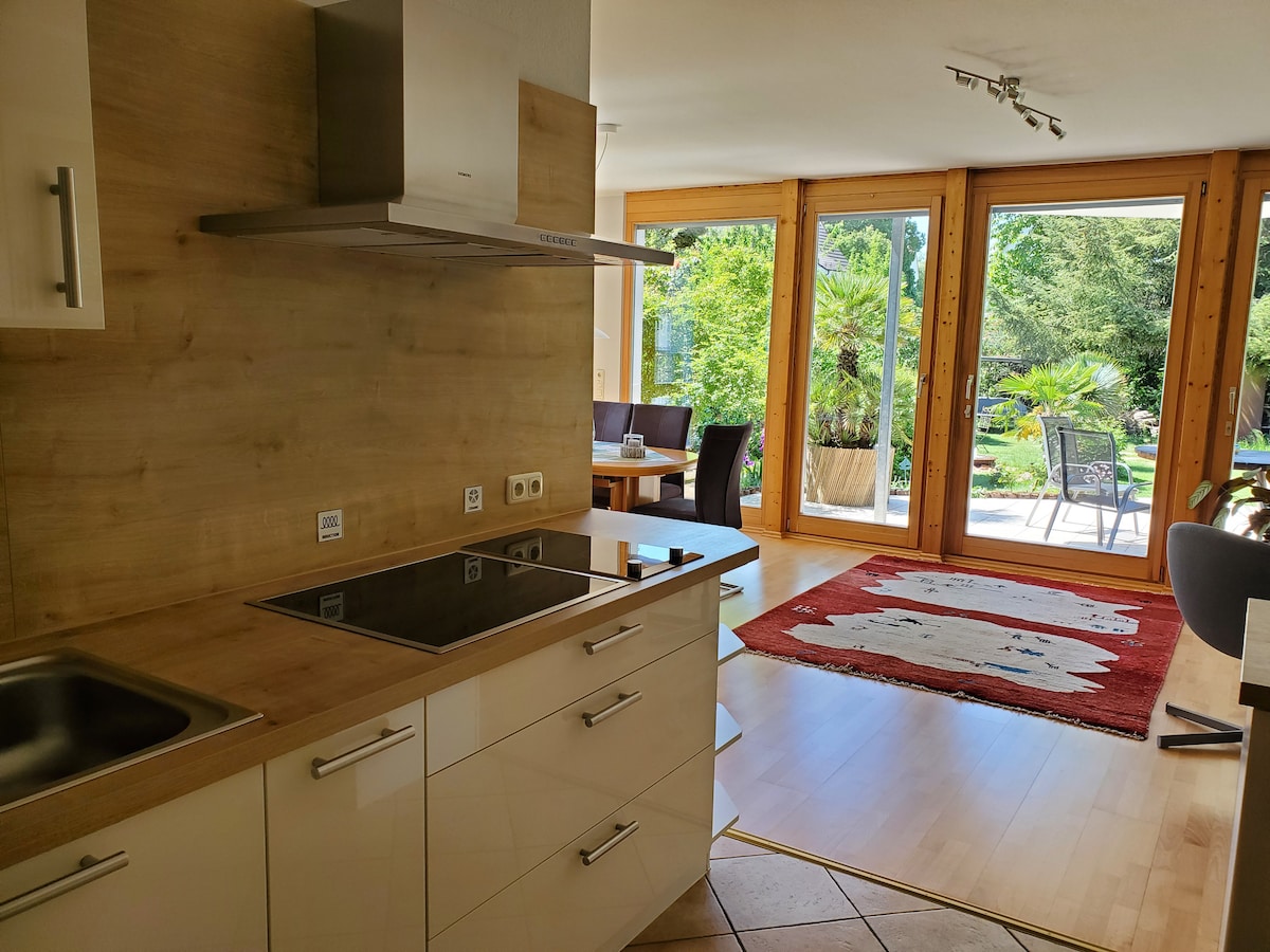 L'apartament recentment reformat i moblat es troba a la planta baixa. Fins a 4 hostes poden allotjar-se aquí en 2 dormitoris separats. Des de la gran sala d'estar-menjador amb espai de treball i cuina oberta pots accedir a la teva pròpia terrassa amb vistes al jardí, que pots compartir. La zona residencial és tranquil·la i, tot i això, no gaire lluny dels punts de contacte importants de la ciutat de Friedberg (a peu: a 3 minuts de l'ajuntament, a 7 minuts de Kaiserstraße, a 15 minuts de l'estació de tren, a 17 minuts del castell).