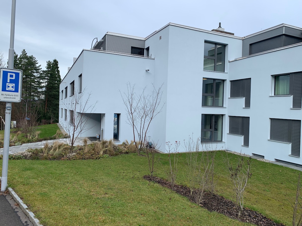 Nou apartament ampli i tranquil (115 m2), amb una vista fantàstica sobre el riu i cap als turons verds. Els hostes tenen accés a una plaça d'aparcament privada al garatge subterrani amb caixa de paret per carregar el cotxe, una cuina d'alta gamma amb forn, planxa de vapor, rentaplats, etc., rentadora/assecadora privada, dos banys (dutxa/lavabo, banyera/lavabo), dos dormitoris i un espai d'oficina còmode. El centre de la ciutat de Zuric està a només 10 minuts amb transport públic i també es pot arribar en bicicleta. Perfecte per a estades llargues i famílies