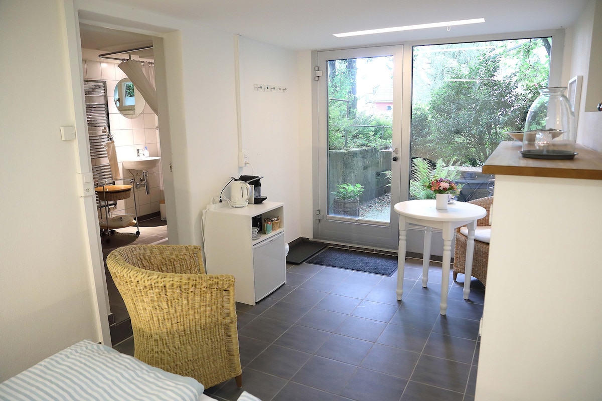 Pis de 2,5 habitacions per a 1-2 persones 1 dormitori ( llit doble) 1 sofà llit a la sala d'estar 1 cuina amb menjador (cafè, te, pasta, salsa, oli, vinagre, espècies) 1 bany amb dutxa i banyera, tovalloles de felpa, assecador de cabells, Dutxa, xampú, loció corporal, raspall de dents, pasta de dents, etc. Excel·lent ubicació a Zuric i, no obstant això, una mica fora, tranquil, jardí, a prop de la parada de tramvia, restaurants, botigues, farmàcia, banc, oficina de correus, a 15 minuts a peu del llac, a 15 minuts amb el tramvia 7 del centre de la ciutat, a prop del bosc