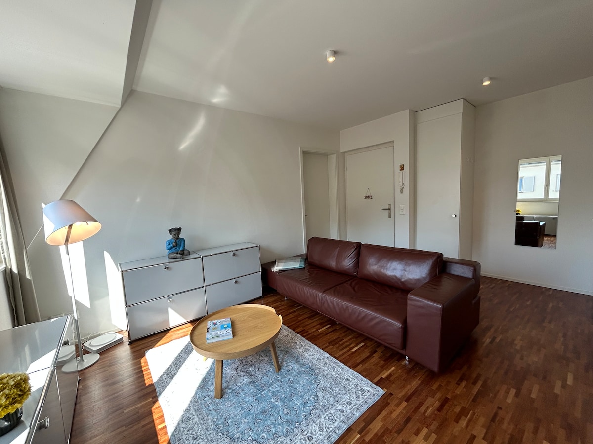 Apartament àtic de 2 habitacions d'alta qualitat, còmode i pràcticament moblat, tranquil·lament situat (3r pis, sense ascensor) al popular districte de Seefeld. El llac, l'òpera i l'estació de tren de Stadelhofen, des del qual es pot arribar a l'aeroport de Zuric en 20 minuts, es troben a 2 minuts a peu. El casc antic, Bahnhofstrasse i el Kunsthaus Zürich es troben a 10 minuts a peu. Dorm tranquil en un llit extragrande de 200 cm x 200 cm. Hi ha un ventilador Dyson i un purificador d'aire per a persones al·lèrgiques.