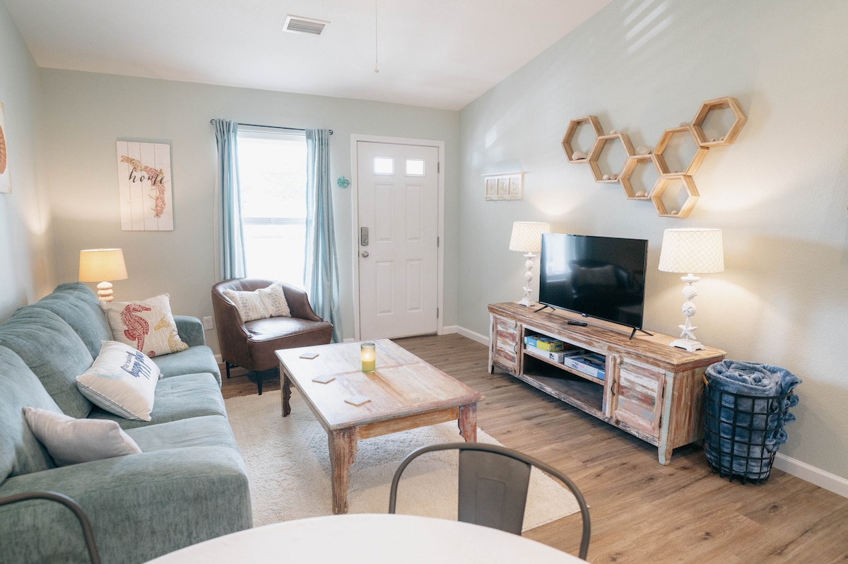 Acceptem animals de companyia !! La teva família estarà a prop de tot quan t'allotgis en aquesta vil·la cèntrica. Només has de portar vestits de bany, cadires de platja i cubells de sorra! A només uns minuts de les platges i a poca distància del centre de la ciutat Sostres abovedats i planta oberta. Hi ha televisor a totes les habitacions, cuina totalment equipada amb la licuadora i un Keurig per al matí següent ! Porxo davanter i posterior cobert, complementat amb una barbacoa d'estil campament al pati completament tancat.