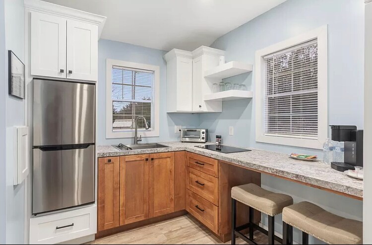 Gaudeix d'una estada moderna i encantadora en aquesta minicasa única. Aquest allotjament està totalment equipat amb una cuina completa, una sala d'estar, un dormitori i un bany complet. Per a una minicasa, aquest espai és impressionantment espaiós! Hi ha un ampli aparcament, així com un adorable porxo frontal amb vistes a un magnífic pati envoltat de boscos. Amb una ubicació còmoda, perfecta per a parelles o solters, ambient increïble a l'interior i a l'exterior.