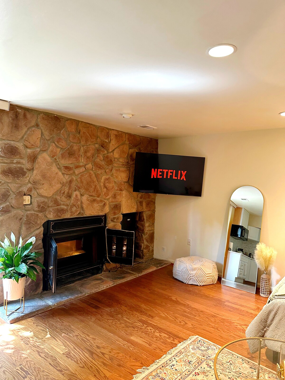 Apartament privat net amb accés directe al soterrani amb dormitori privat (llit de matrimoni); a més de llit doble plegable per a un tercer hoste, bany complet privat; cuina americana equipada amb nevera, cafetera Keurig, vitroceràmica, bullidor, microones i torradora; ampli saló amb llar de foc equipat amb televisor (Netflix) i wifi gratuït. Taula de menjador amb dues cadires. Utensilis de cuina i coberteria bàsics. Espai de treball: escriptori, cadira giratòria. El camí d'entrada és inclinat i pot ser difícil per als hostes amb problemes de mobilitat.
