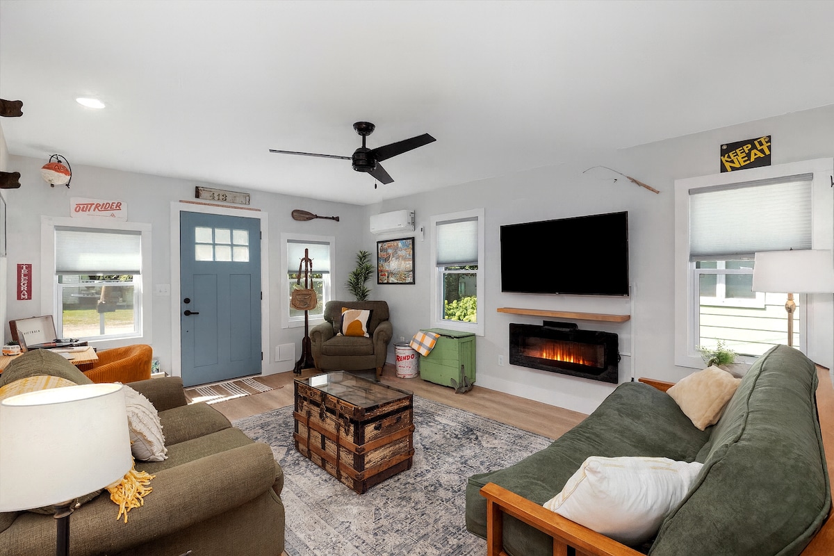 Unique one-room cottage on the bank of the Huron River. A half-mile walk to the pedestrian-friendly Village of Milford, known for its array of shops, restaurants, outside dining, concerts, and festivals. Perfect bungalow for single, couple, or small family. Living area has double sofa bed. Tiny home with many unique features. Fire pit at river's edge for relaxing or roasting marshmallows, and a gas grill on the dining patio. Two sit-in kayaks available and more can be rented nearby.