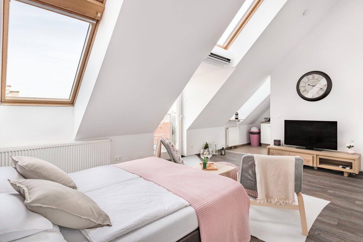 Pis de disseny amb estil de 40 m² en un pati tranquil, ideal per a nits de descans a Viena. Gaudeix d'un llit de mida king sota el sostre inclinat, aire condicionat, wifi ràpid i televisor intel·ligent amb Netflix. La cuina totalment equipada és perfecta per a estades curtes o llargues. Relaxa't al balcó privat amb vistes a la teulada. A només 2 minuts del metro i a uns 10 minuts del centre de la ciutat. Ideal per a parelles, persones que viatgen soles i viatges de negocis.