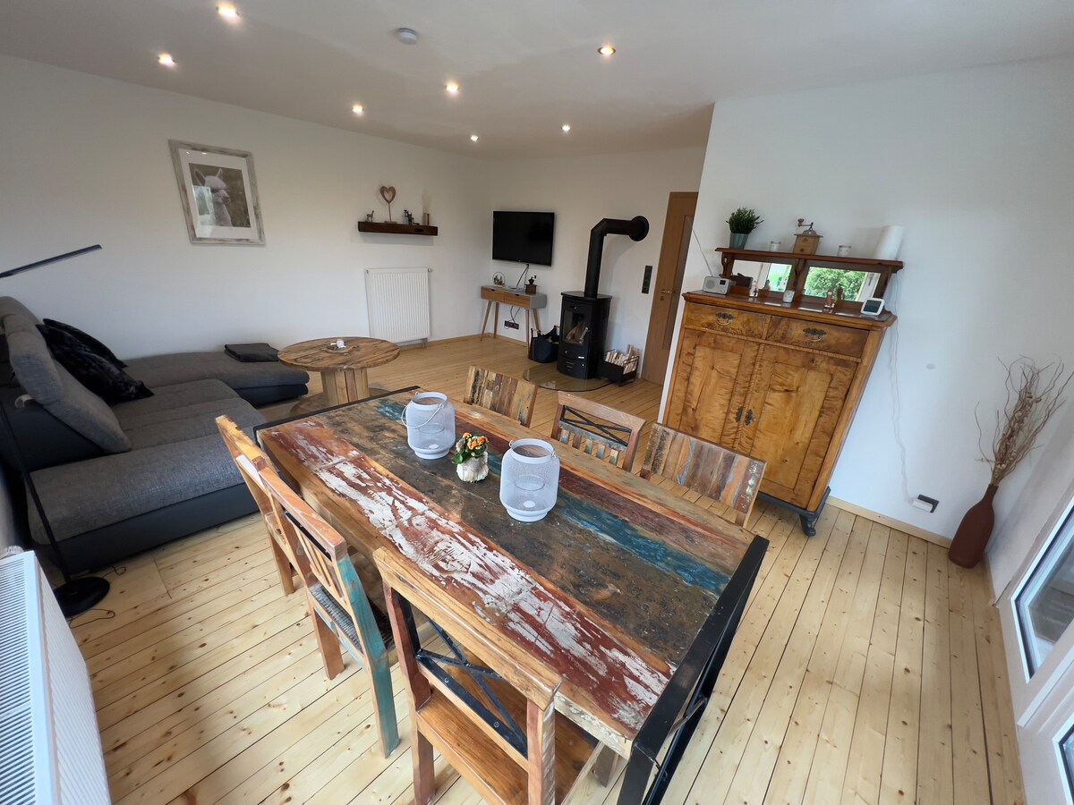 L'apartament de la primera planta està situat en un turó prop de Rosbach, tranquil·lament al final del poble. Els senders per caminar pels pintorescos voltants són a 5 minuts i al jardí, mantingut amb molt de gust, hi ha una zona de terrassa amb vistes reservada per als hostes. L'accés al jardí comença des de la plaça d'aparcament. Vivim a la planta baixa de la casa i esperem trobar-nos o saludar-nos amistosament al jardí. Tornarem a fer d'amfitrions perquè nosaltres mateixos hem tingut experiències molt boniques amb els viatges.