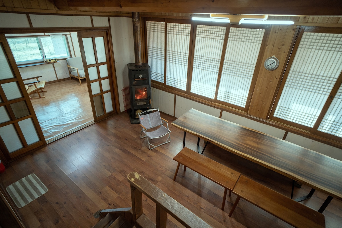 Pyeongchang, Gangwon-do, el millor lloc per descansar a una altitud de 700 metres. Un autèntic recorregut pel camp amb només muntanyes i núvols, unes quantes cases privades i horts de les terres altes. Però hi ha moltes coses per a algú! Dues habitacions de mida queen amb pintures, música analògica i llibres, una sala d'estar espaiosa i una gran terrassa oberta a la natura. Una casa de camp amb aigua i aire clars, estrelles al cel nocturn i tranquil·la! Si agafes un autobús amb destinació a Ungyo des de la terminal de Dong Seül, arribarà en una hora i mitja! * L'estació d'esquí WELLI HILLI es troba a 20 minuts en cotxe. * Reserva prioritària per a 4 persones o més els dissabtes, festius i temporades de vacances. * Accés independent bàsic. * + TV i Netflix disponibles! * L'estació d'esquí més propera està a 20 minuts amb cotxe del carrer Welli Hill. * Per a les estacions de tren, agafa un taxi després d'utilitzar l'estació de Dunnae que l'estació de Pyeongchang. * Un poble de muntanya gairebé sempre atrapat en la neu blanca a l'hivern. No obstant això, excepte en casos especials, la reconstrucció es duu a terme perquè els cotxes puguin arribar a l'aparcament a prop de l'allotjament.