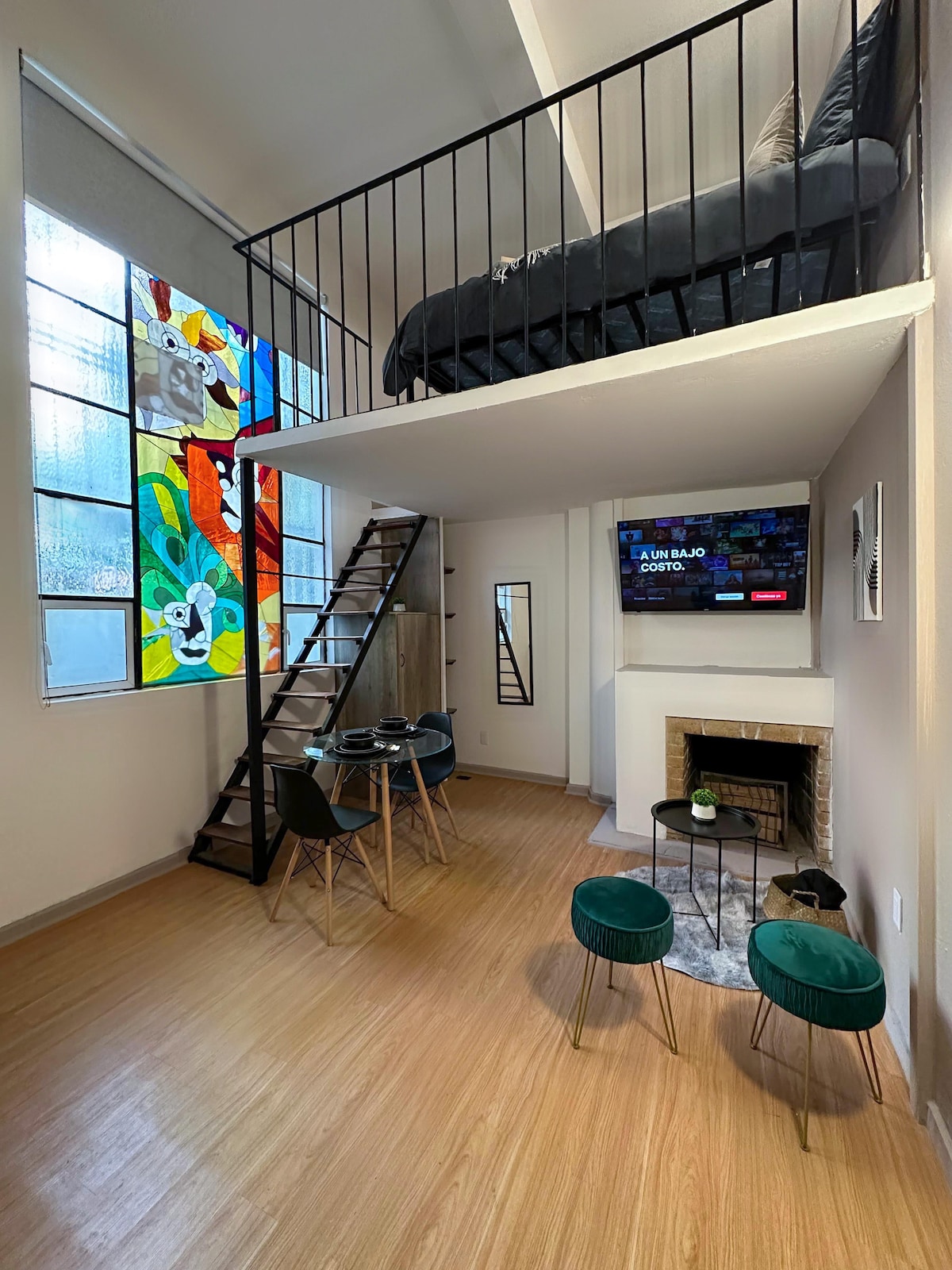 Este encantador loft con increíble estilo se ubica dentro de una casona de principios del siglo XX. Única en la zona Escandon, con excelente ubicación y extraordinaria cercanía a la Colonia Condesa, Roma, Napoles, y zona centro de la CDMX. Aquí tendrás un espacio que cuenta con una sala, comedor, cocineta, tv, wifi, baño privado y un mezzanine con cama queen. También contarás con un jardín privado bajo la sombra de un hermoso árbol de jacarandas. Tenemos dos amigables perros en el jardín común.