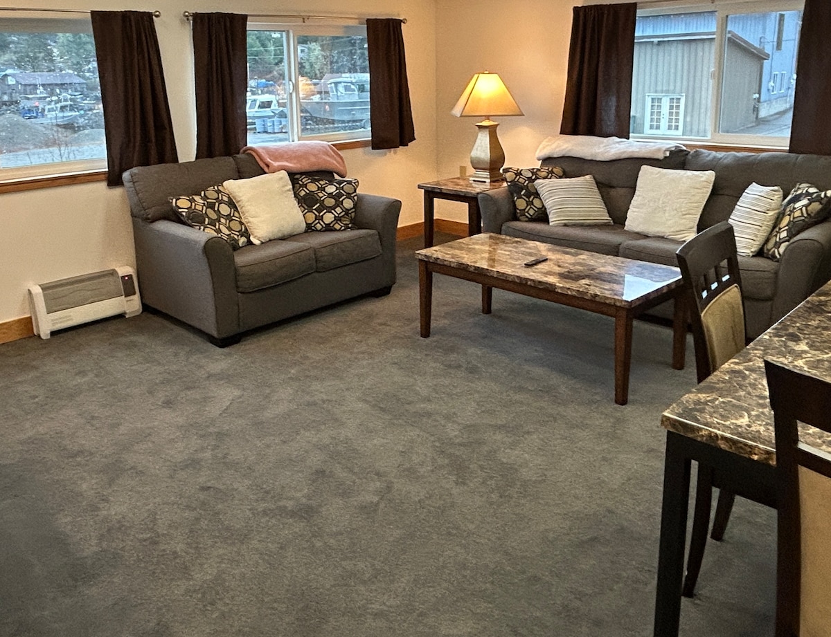 Pis tranquil d'1 dormitori a la planta superior amb entrada privada. Situat al Big Salt Lake. Wifi, televisor intel·ligent, sala d'estar, cuina completa, bany, dormitori amb llit «queen size». Rentadora i assecadora. Cotxe de lloguer disponible (servei de pagament). No hi ha despeses de neteja, s'espera que l'hoste netegi després de fer servir l'espai. A 3 milles de l'aeroport de Klawock.