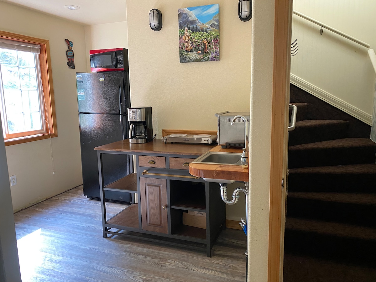 Our units are nestled in the heart of the historic community of Thorne Bay. This two bedroom getaway is centrally located right in the middle of town, but feels like you're out in the country! Our upper unit offers two bedrooms, a fully-equipped kitchen, bathroom and a washer & dryer. There is a full bed that can accomodate 2 people and two twin beds in the loft. The loft stairs are steep and are not a good fit for small children. Lots of sunshine, privace and peace!