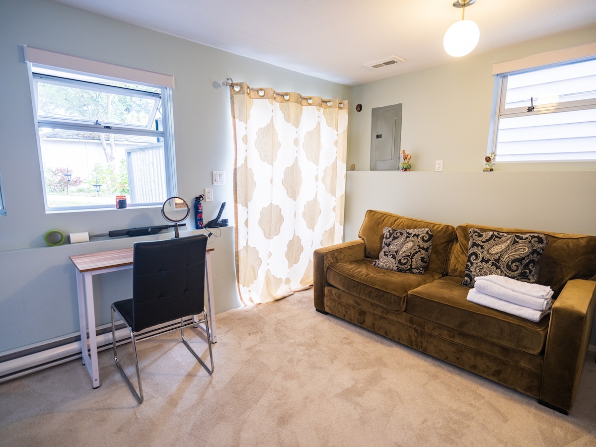 Estudi lluminós, net i soterrani amb cuina petita, bany i pati d'entrada privat i jardí. Aparcament gratuït al carrer. A prop de les parades d'autobús; a només 10 minuts de la UBC i a 25 minuts del centre de la ciutat. A dues maneres de restaurants, botigues, senders a Pacific Spirit Park i un camp de golf públic. A peu de platges fantàstiques. Bicicletes disponibles en una ubicació compartida a prop. Inclòs Llit «queen size», escriptori, serveis, nevera, microones, cuina de 2 plats, televisor de pantalla plana i wifi d'alta velocitat. Bany privat amb banyera i dutxa.