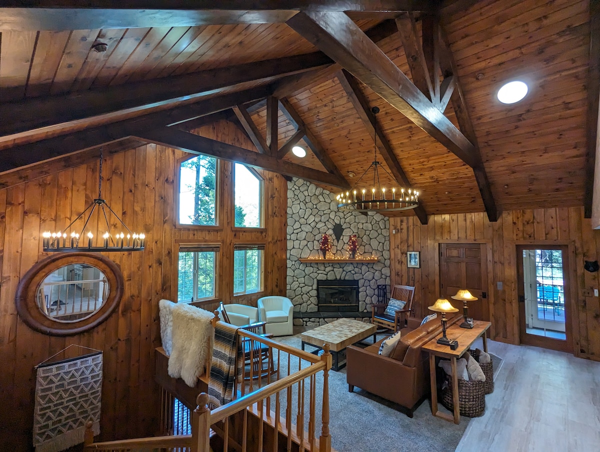 Aquesta casa té tot el que necessites per a 1, 2 o 3 famílies per reunir-te o per fer una escapada relaxant. Espai enorme amb sostres de 20 peus i 4 clarabois ventilats, vista al llac, taula de billar, 2 televisors intel·ligents grans i una gran llar de foc. La coberta superior té una taula gran, barbacoa i seients còmodes. 2 lofts connectats amb futbolí, arcade i un munt de jocs. Afegeix el pit de pilota per fer d'aquesta casa un somni infantil fet realitat. A poca distància en cotxe de Sky Park o Snow Valley. Big Bear està a només 45 minuts.