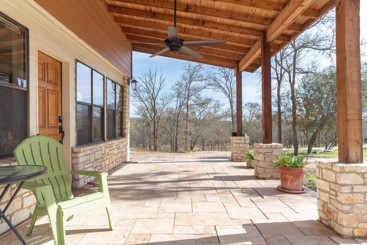 Una escapada romàntica en una granja privada de 5 hectàrees. Observa la posta de sol mentre et relaxes al porxo protegit o a la terrassa del segon nivell. A 30 minuts del centre d'Austin, el Circuit de les Amèriques, l'aeroport d'Austin i el parc estatal de Bastrop. Gran observació d'ocells, incloent-hi gavins, corbs, cardenals i colibrís. Al camí migratori de diverses espècies d'ocells i papallones. Starlink internet et mantindrà connectat mentre et relaxes i gaudeixes del teu temps de descans. Gaudeix dels jardins de verdures i flors.