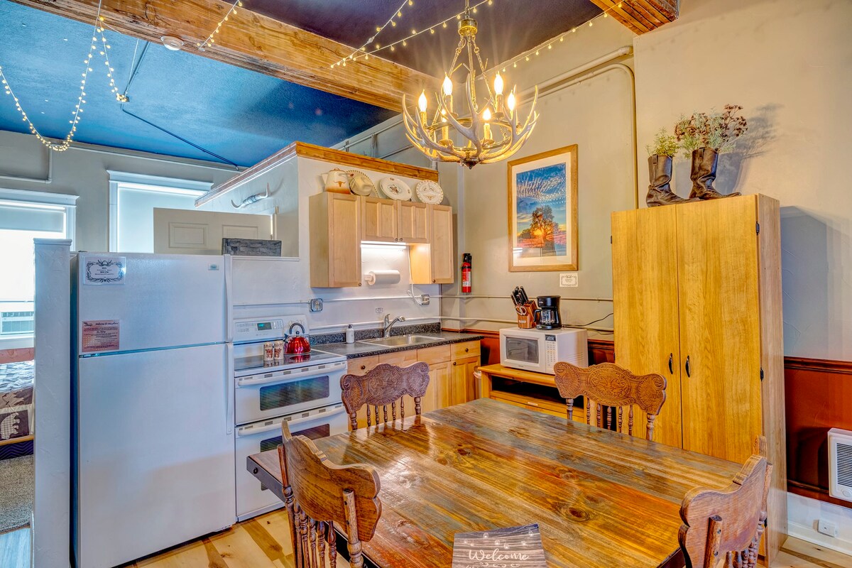Moderna suite industrial amb capacitat per a 6 persones, cuina completa i 2 banys. Dissenyat amb una vora moderna de matèries primeres i línies netes. Sembla un apartament obert i urbà al cor del salvatge país històric de l'oest.