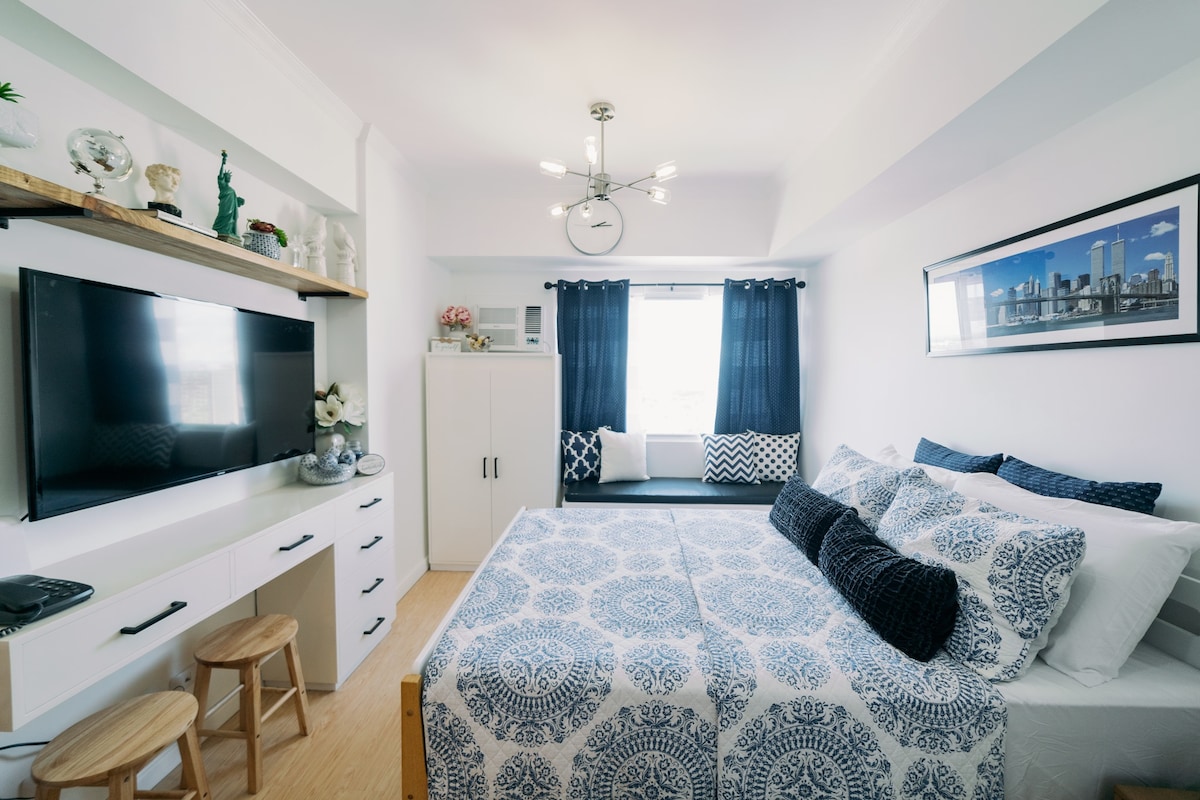 Estudi ben cuidat (per a 3 persones) al cor de la ciutat, a prop del centre comercial Ayala Centrio. A la 4a planta amb llit de mida KING i sofà llit. Equipat amb wifi d'alta velocitat (200 Mbps) Globe Parafiber, televisor intel·ligent i Netflix. Bany complet amb bidet, tovalloles de qualitat d'hotel, gel de dutxa i xampú. Cuina completa amb estris i un galó d'aigua potable GRATIS. Amb vistes a la piscina (piscina per a adults i nens). A prop hi ha botigues de menjar, bugaderies, botigues de conveniència i bars 24 hores. Reserva🎖️