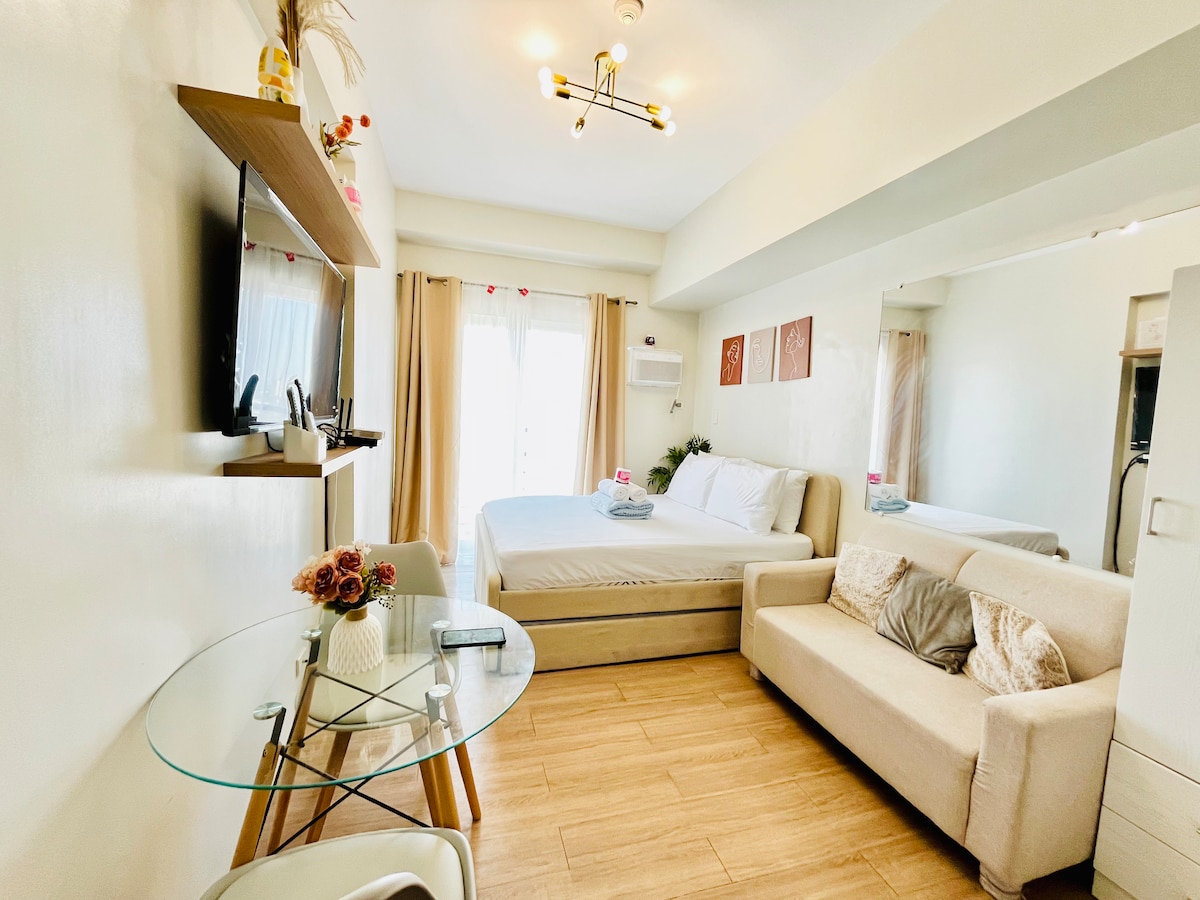 Estudi ben cuidat (per a 3 persones) al cor de la ciutat, a prop del centre comercial Ayala Centrio. A la 4a planta amb llit de mida KING i sofà llit. Equipat amb wifi d'alta velocitat (200 Mbps) Globe Parafiber, televisor intel·ligent i Netflix. Bany complet amb bidet, tovalloles de qualitat d'hotel, gel de dutxa i xampú. Cuina completa amb estris i un galó d'aigua potable GRATIS. Amb vistes a la piscina (piscina per a adults i nens). A prop hi ha botigues de menjar, bugaderies, botigues de conveniència i bars 24 hores. Reserva🎖️