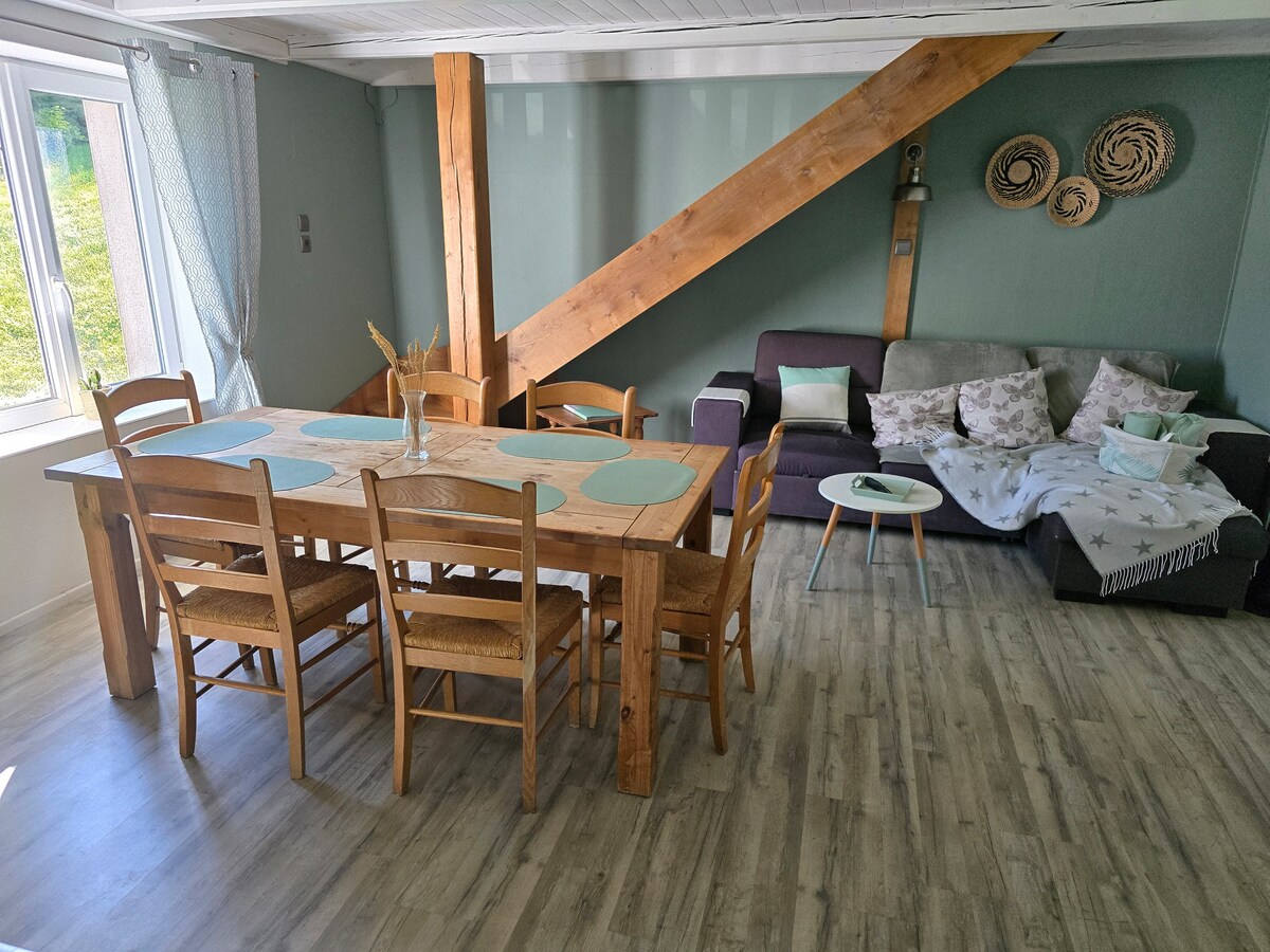 Creada el 2020, còmode, respecta l'esperit d'aquesta antiga masia en una parcel·la de 2800 m2 . Accés independent - Aparcament fàcil Situat en un poblet de 4 cases al cor del camp, a només 5 minuts de l'autopista, a 10 mm de Remiremont (TGV) Plombières les Bains, a 25 mm de Gérardmer, La Bresse o Epinal. Fantàstic per als ciclistes. Gaudiràs de la gran cuina, la seva llar de foc, la sala d'estar de fusta i pedra, el BALNEARI, els 3 dormitoris i els seus banys individuals