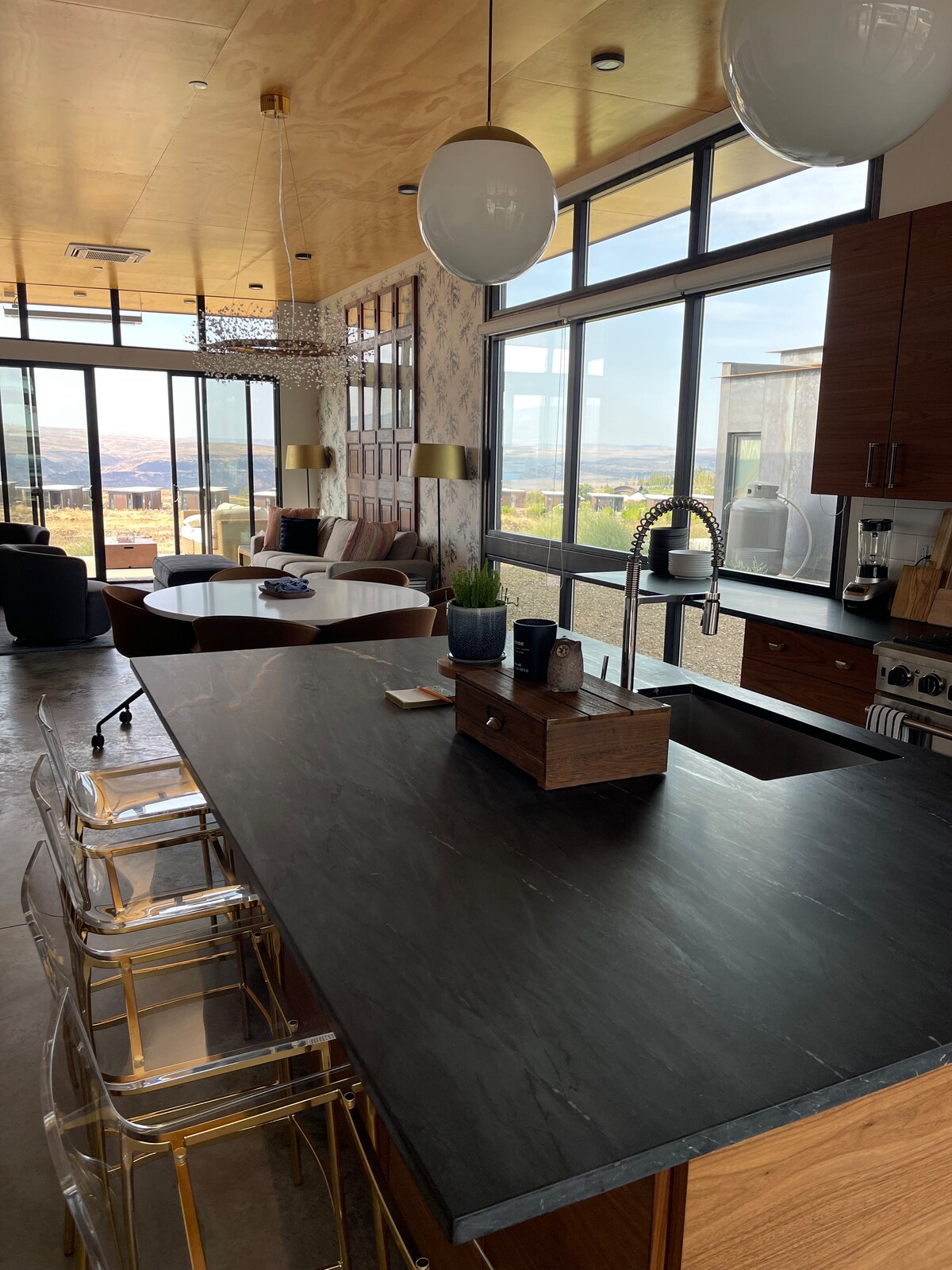 Aquesta casa està construïda amb materials naturals per l'arquitecte galardonat Olsen Kundig per barrejar-se en un bonic entorn entre les vinyes de Cave B Winery Estate. Amb unes vistes increïbles des de la cuina, la terrassa i el dormitori principal, aquesta és la escapada perfecta per a la família i els amics. Fes un passeig per l'interior del nostre peloton, organitza un concert, fes surf de rem a l'aigua, segueix les rutes de senderisme fins al riu Columbia i gaudeix d'un recorregut de 10 minuts a peu fins al celler, el balneari i l'amfiteatre Gorge.