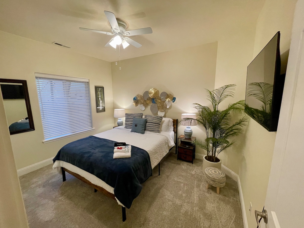 Escapa't a un estudi elegant de 2 llits i 6 persones, amb una cuina petita ben equipada, un menjador, un kit de s 'mores i galetes. Relaxa't al sofà còmode de la sala d'estar amb un televisor Roku o descansa a la hamaca interior. El bany d'inspiració a Bali disposa d'una àmplia dutxa de pedra per a dues persones. A l'exterior, gaudeix d'una foguera, un mini camp de golf i un cornhole. Necessites un cotxe? Consulta el nostre lloguer Tesla Model 3 del 2023.