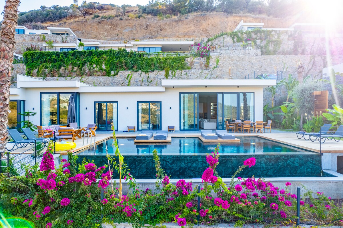 Sunset Villa Bodrum - Infinity Pool & Sea View; This exceptional villa offers one of the most stunning sunset views in Bodrum, combining privacy, comfort, and a refined holiday experience. With 4 en-suite bedrooms and accommodation for up to 9 guests including children, it is perfectly suited for families and groups of friends. The infinity pool blends seamlessly with the Aegean Sea throughout the day, while evenings transform into unforgettable moments with breathtaking sunsets.